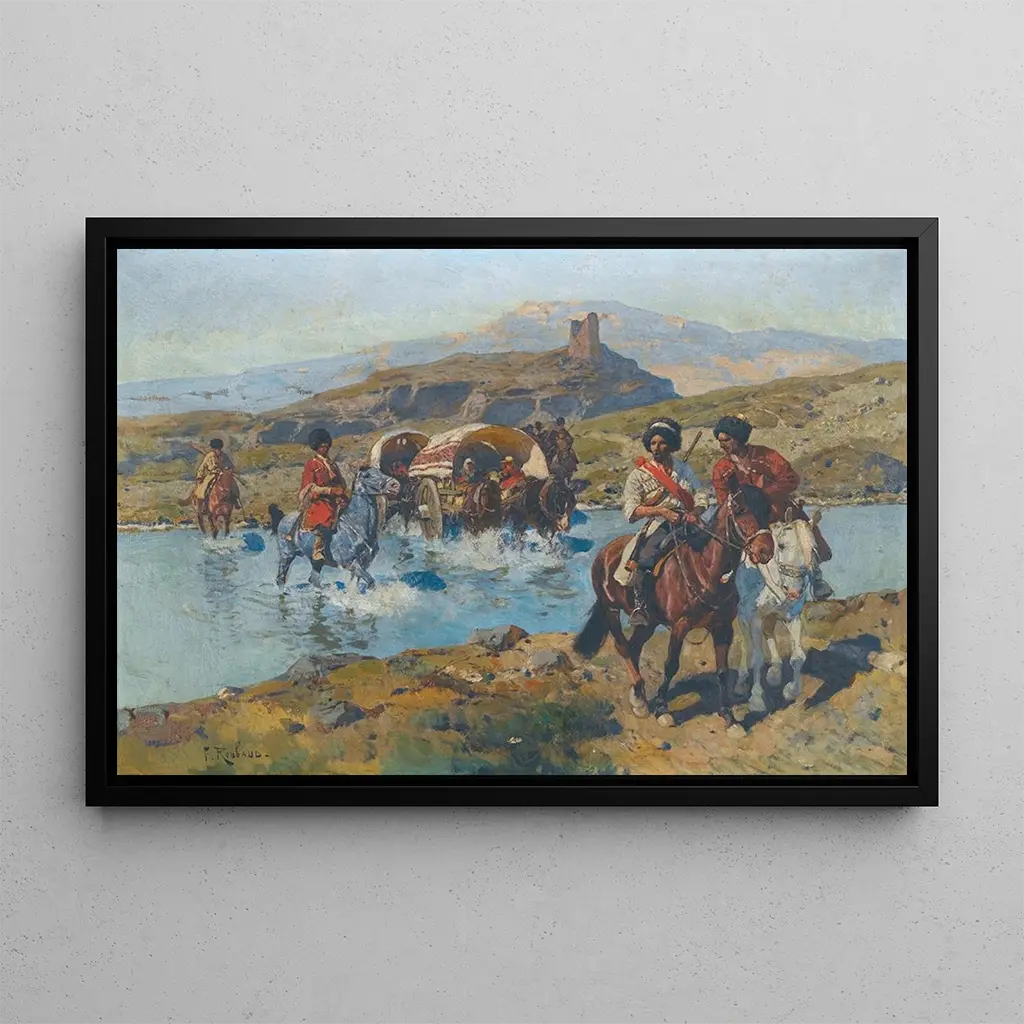 I "Cosaques traversant un gué" fångar Franz Roubaud ett ögonblick av mod och beslutsamhet. Detta konsttryck skildrar en grupp av cosaques, ikoniska figurer i den ryska kulturen, som modigt ger sig ut över ett stormigt vattendrag. De jordnära färgerna och de dynamiska rörelserna hos hästar och män skapar en livfull och energifylld scen. Roubaud lyckas förmedla intensiteten i handlingen, samtidigt som han framhäver den vilda skönheten i det omgivande landskapet, där naturen och människan vävs samman i en episk dans.