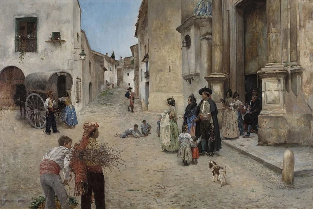 Konsttrycket av "Kyrkoutgång" av Prudencio Herreros Amat fångar ett ögonblick av gemenskap och delaktighet inom en gemenskap. Personerna, klädda i traditionella kostymer, samlas vid kyrkans utgång, deras ansikten uttrycker en rad känslor från glädje till eftertanke. De varma och jordnära färgerna, typiska för konstnärens stil, tillför en mänsklig dimension till denna scen, medan det naturliga ljuset subtilt belyser de arkitektoniska detaljerna i kyrkan. Detta verk inbjuder till reflektion över andlighet och sociala band, samtidigt som det hyllar vardagens skönhet.
