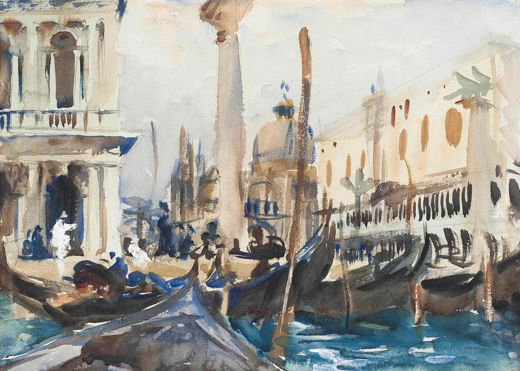"La Piazzetta med gondoler" av John Singer Sargent framkallar den tidlösa skönheten i Venedig och fångar essensen av denna ikoniska stad genom en harmonisk komposition. Gondolerna, elegant uppradade, speglar sig i de lugna vattnen, medan den majestätiska arkitekturen hos venetianska byggnader reser sig i bakgrunden. Färgpaletten, dominerad av mjuka och ljusa nyanser, skapar en fridfull och drömmande atmosfär. Sargent, med sin mästerlighet i ljus och skugga, lyckas förmedla magin i denna plats och inbjuder betraktaren att drömma sig bort till detta förtrollande landskap.