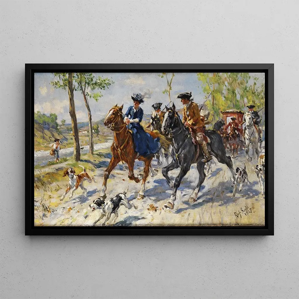 "La sortie à cheval" de Raffaello Sorbi capture un instant fugace où l'élégance et le mouvement se rencontrent. Cette toile dépeint une scène vivante, où des cavaliers, vêtus de costumes raffinés, s'apprêtent à quitter un cadre bucolique. Les couleurs vives et les détails minutieux des vêtements contrastent avec la douceur des paysages environnants, créant une atmosphère dynamique et joyeuse. Sorbi, maître du mouvement, réussit à transmettre une sensation de légèreté et de liberté, invitant le spectateur à ressentir l'excitation de cette sortie. Chaque personnage semble animé d'une histoire, rendant l'œuvre encore plus captivante.