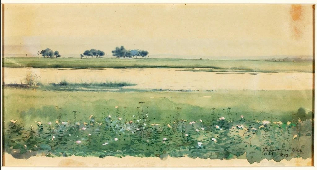 De Lancey Gill, verksam i början av 1900-talet, är känd för sina uttrycksfulla landskap som fångar essensen av den amerikanska naturen. Påverkad av impressionismen, utvecklade han en unik stil som förenar realism och poesi. Hans verk, ofta inspirerade av landskapen i New England, vittnar om en särskild känslighet för ljus och färg. Gill spelade en viktig roll i utvecklingen av landskapsmåleriet i Amerika och bidrog till att höja naturen till ett konstnärligt motiv.