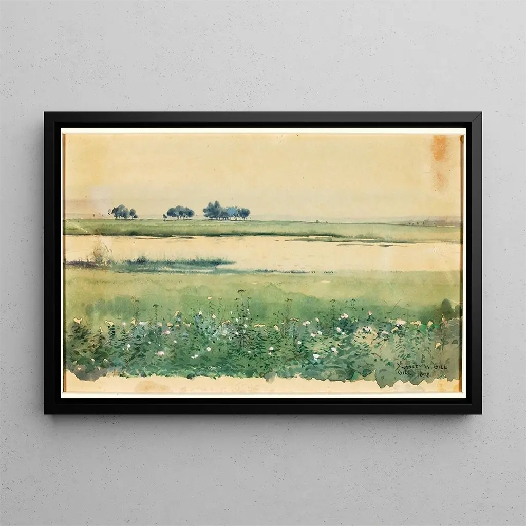 I denna konsttryck av målningen Paysage avec marais tar De Lancey Gill oss med till en fridfull värld där naturen blomstrar. De mjuka färgerna och nyanserna av grönt blandas harmoniskt, vilket skapar en lugnande atmosfär. Gill's teknik, kännetecknad av delikata penseldrag, ger liv åt varje element i landskapet, från reflektioner i vattnet till frodiga lövverk. Detta konsttryck inbjuder till eftertanke och erbjuder en stund av vila för betraktaren, som ett öppet fönster mot en idyllisk värld.