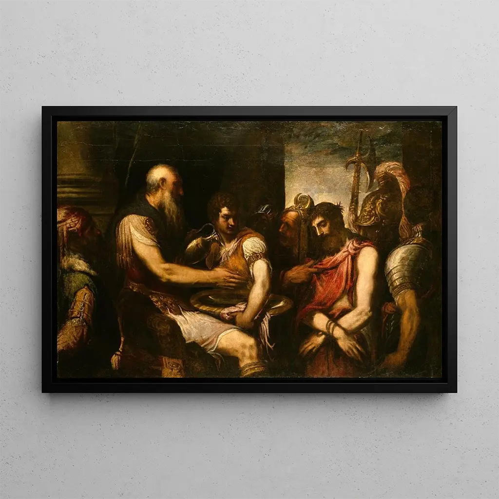 Le tableau "Le Christ devant Pilate" d'Andrea Schiavone est une œuvre saisissante qui capte l'intensité du moment où Jésus se tient devant le gouverneur romain. Les couleurs riches et les contrastes saisissants créent une atmosphère de tension palpable. La composition dynamique, avec des figures expressives et des gestes éloquents, invite le spectateur à ressentir l'angoisse et la détermination qui émanent de cette scène biblique. Les détails minutieux des vêtements et des visages témoignent de la maîtrise technique de Schiavone, tandis que l'utilisation de la lumière accentue le drame et la profondeur émotionnelle de l'œuvre.