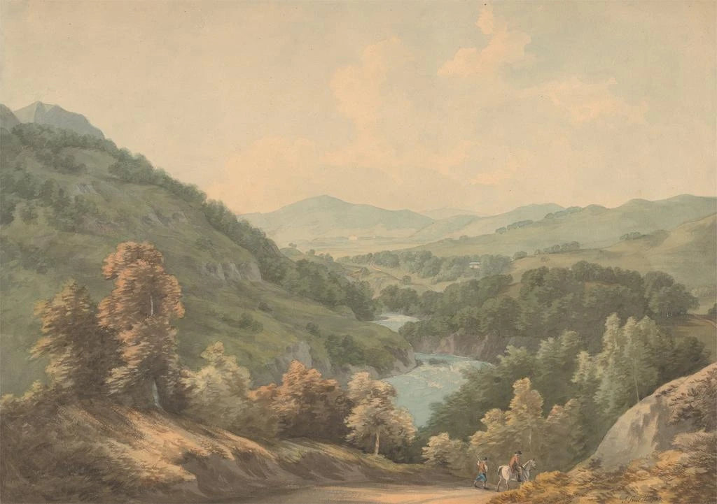 Le tableau Le Col de Killiecrankie, réalisé par John Warwick Smith, invite à une immersion dans un paysage majestueux. Les nuances de vert et de bleu se mêlent harmonieusement, évoquant la sérénité des montagnes écossaises. La technique aquarelle, si délicate, permet de capturer la lumière et l'atmosphère changeante de cet environnement naturel. Les détails minutieux des arbres et des rochers ajoutent une profondeur à la composition, tandis que le ciel, parsemé de nuages, semble respirer avec le tableau. Cette œuvre est une véritable ode à la beauté sauvage, transportant le spectateur au cœur de la nature.