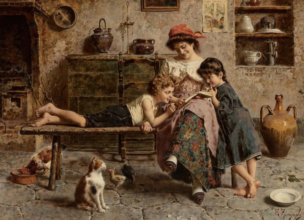 L'œuvre "L'heure du conte" d'Eugenio Zampighi évoque une atmosphère chaleureuse et intime, où un groupe d'enfants, captivés, écoute un récit enchanteur. La composition est riche en détails, avec des couleurs douces et lumineuses qui illuminent la pièce. Les jeux d'ombre et de lumière créent une ambiance presque féerique, tandis que les expressions des enfants témoignent de leur émerveillement. Zampighi réussit à capturer ce moment précieux, où l'imagination des jeunes esprits s'éveille, offrant ainsi une véritable invitation à la contemplation et à la nostalgie de l'enfance.