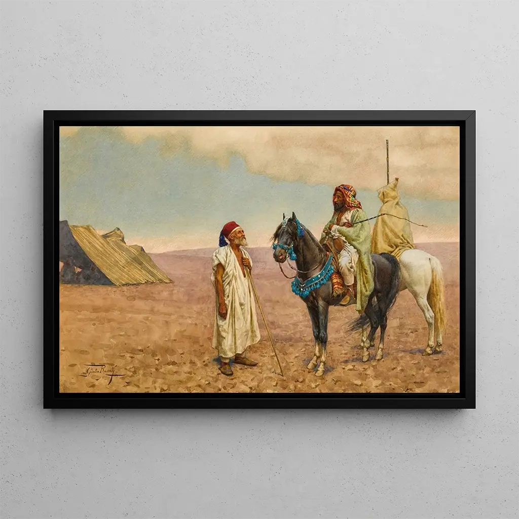 Le Messager : en hyllning till vardagens skönhet I "Le Messager" fördjupar sig Giulio Rosati i en intim scen där ljuset leker med skuggorna och avslöjar detaljernas finhet. Kompositionen framhäver en ung man, klädd i en traditionell tunika, som verkar förmedla ett viktigt budskap. De varma färgerna, dominerade av jordnära toner och inslag av blått, skapar en atmosfär som är både lugn och fylld av känslor. Rosatis teknik, som blandar realism och romantik, inbjuder betraktaren att känna intensiteten i ögonblicket, som om man kunde höra budbärarens viskningar. Giulio Rosati : en mästare av orientalismens realism Giulio Rosati, italiensk målare från 1800-talet, är erkänd för sina konstverk som fångar essensen av orientaliska kulturer. Påverkad av sina resor till Nordafrika och Mellanöstern, har han lyckats översätta skönheten och komplexiteten i dessa regioner genom sin konst. Aktiv främst mellan 1870 och 1900, tillhör Rosati den orientalismens rörelse som fascinerade många konstnärer under sin tid. Hans stil, kännetecknad av ett stort detaljintresse och en rik palett, vittnar om en tid då Orienten sågs som en plats av mysterium och exotism, och erbjöd en fönster mot avlägsna världar. En dekorativ konsttryck med många fördelar Konsttrycket av "Le Messager" är ett dekorativt föremål som kommer att berika ditt hem, oavsett om det är i ett vardagsrum, ett kontor eller ett sovrum. Dess utskriftskvalitet och trohet mot de ursprungliga färgerna gör detta konsttryck till ett perfekt val för konstälskare. Den estetiska dragningskraften i detta verk ligger i dess förmåga att väcka nyfikenhet och skapa samtal. Genom att integrera detta konsttryck i din inredning tillför du en touch av elegans och kultur, samtidigt som du hyllar en konstnär vars verk fortsätter att resonera genom tiderna.