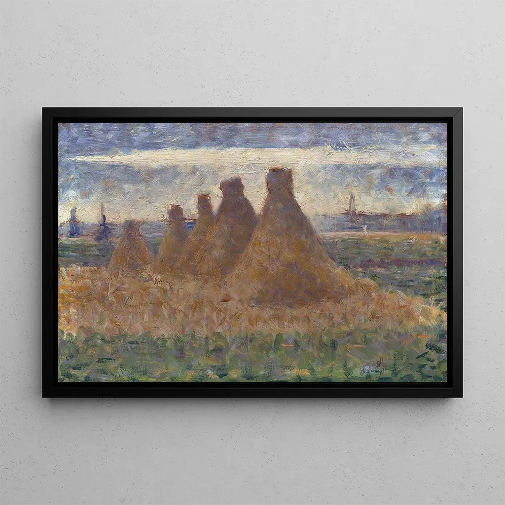 Meules de foin : une ode à la lumière et à la nature Les "Meules de foin" de Georges Seurat capturent l'essence d'un paysage rural baigné de lumière. À travers une palette de couleurs vibrantes, l'artiste utilise la technique du pointillisme pour créer une atmosphère sereine et poétique. Les touches de peinture, appliquées avec précision, forment une composition harmonieuse où les meules se dressent majestueusement sous un ciel d'été. L'œuvre évoque une sensation de tranquillité, invitant le spectateur à s'immerger dans cette scène bucolique, où le temps semble suspendu. Georges Seurat : pionnier du néo-impressionnisme Georges Seurat, né en 1859, est un artiste majeur du mouvement néo-impressionniste, connu pour sa technique innovante et son approche scientifique de la couleur. Influencé par des artistes comme Delacroix et les théories coloristes de Chevreul, Seurat a cherché à explorer les effets de la lumière et de la couleur sur la perception visuelle. Sa période la plus prolifique, à la fin du XIXe siècle, a marqué un tournant dans l'histoire de l'art, posant les bases du modernisme. Les "Meules de foin" témoignent de son génie, mêlant observation minutieuse et expression artistique. Une acquisition décorative aux multiples atouts Opter pour la reproduction des "Meules de foin" de Seurat, c'est choisir une toile qui enrichira votre intérieur par son charme intemporel. Que ce soit dans un salon, un bureau ou une chambre, cette œuvre apportera une touche de nature et de sérénité à votre décoration. Sa qualité de reproduction garantit une fidélité aux couleurs et aux détails, permettant de profiter pleinement de l'esthétique de l'original. Avec son attrait visuel, cette reproduction est un choix idéal pour ceux qui souhaitent allier art et décoration, tout en célébrant l'héritage d'un maître de l'impressionnisme.