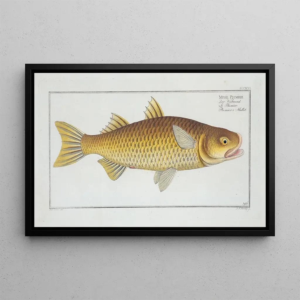 La reproduction de Mugil Plumeri, le Mulet de Plumer, nous plonge dans l'univers aquatique grâce à la précision et au réalisme de Marcus Elieser Bloch. Ce tableau met en avant le mulet, un poisson emblématique, représenté avec une attention minutieuse aux détails anatomiques. Les nuances de bleu et de vert évoquent les profondeurs marines, tandis que la lumière joue sur les écailles, créant un effet de brillance captivant. La technique de Bloch, mêlant aquarelle et gravure, permet de rendre hommage à la beauté de la faune sous-marine, offrant ainsi une vision à la fois scientifique et artistique de cet animal.