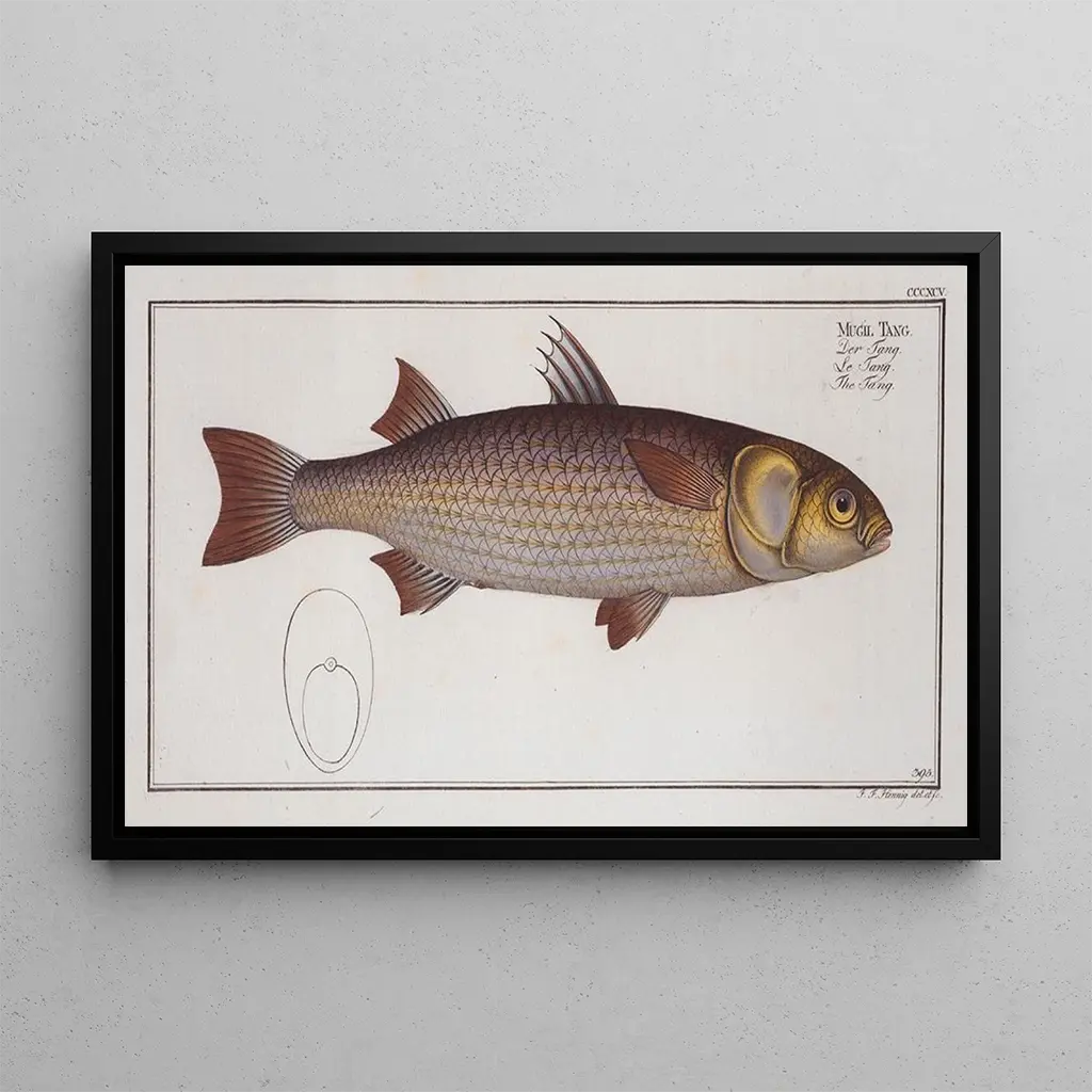 La reproduction Mugil Tang Le Tang de Marcus Elieser Bloch évoque une scène sous-marine vibrante où les poissons se déplacent avec grâce. Les couleurs chatoyantes, allant des bleus profonds aux jaunes éclatants, créent une atmosphère vivante et dynamique. La technique de l’aquarelle, maîtrisée par l’artiste, permet de capturer la fluidité de l’eau et le mouvement des créatures marines. Chaque détail, des écailles scintillantes aux reflets lumineux, contribue à une immersion totale dans cet univers aquatique. Bloch réussit à transmettre une sensation de légèreté et de sérénité, invitant le spectateur à plonger dans cette représentation poétique de la vie sous-marine.