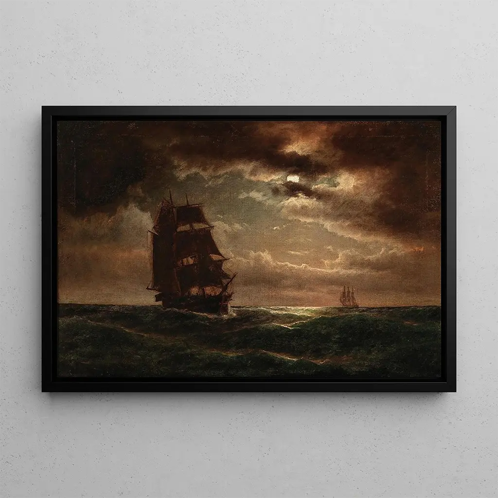 La reproduction Nuit de Lune avec Trois-mâts évoque une scène maritime empreinte de mystère et de poésie. La lune éclaire délicatement les voiles des trois-mâts, créant des reflets scintillants sur les vagues. Les teintes sombres du ciel se mêlent à des touches de lumière argentée, offrant un contraste saisissant qui attire l'œil. Anton Melbye, avec sa maîtrise de la lumière et de l'ombre, parvient à capturer l'essence d'une nuit paisible en mer, où le calme et la beauté se rencontrent. Cette œuvre invite à la rêverie, transportant le spectateur vers des horizons lointains.