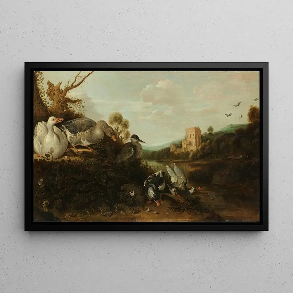 La toile "Oiseaux aquatiques" de Gijsbert Gillisz de Hondecoeter est une célébration de la nature à travers une représentation vibrante d'oiseaux en pleine activité. Les plumages éclatants, allant des rouges profonds aux bleus éclatants, se détachent sur un fond de verdure luxuriante. Gillisz de Hondecoeter excelle dans l'art de capturer le mouvement et la grâce des oiseaux, créant une atmosphère vivante et joyeuse. Chaque détail, des plumes aux reflets de l'eau, est traité avec une minutie qui témoigne de son talent exceptionnel. Cette œuvre invite à une contemplation des merveilles de la faune aviaire.