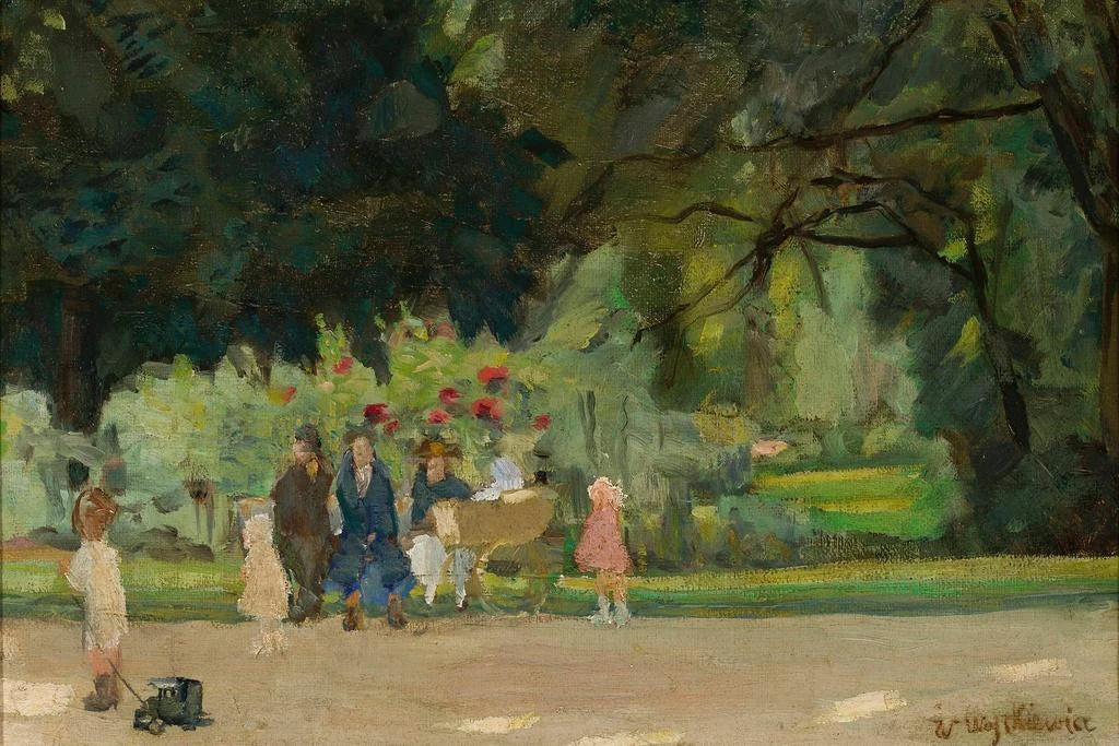 Witold Wojtkiewicz, verksam i början av 1900-talet, är erkänd för sin förmåga att fånga skönheten i det polska landskapet. Påverkad av impressionismen, utvecklade han en unik stil som förenar realism och poesi. Hans verk, ofta inspirerade av naturen och vardagslivets scener, speglar en särskild känslighet för ljus och färger. Parc Planty, ett av hans återkommande motiv, illustrerar perfekt hans talang för att skildra lugnet i gröna områden i staden, samtidigt som det understryker naturens betydelse i det urbana livet.