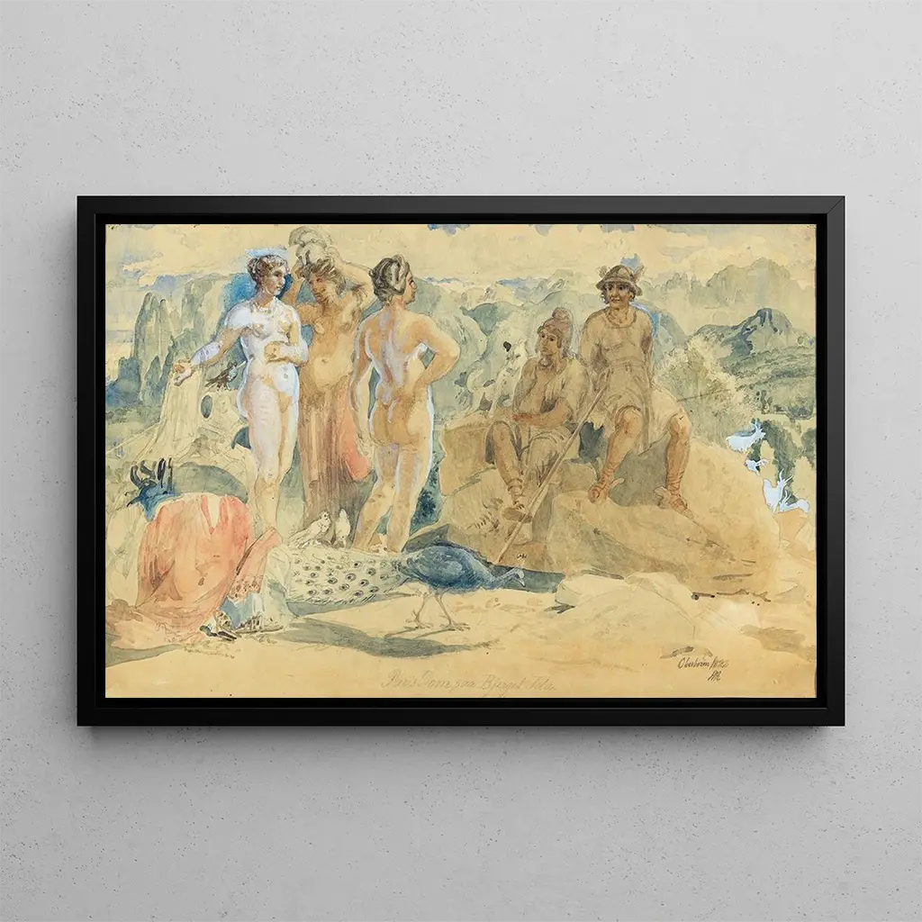 "Le Jugement de Pâris" är ett fängslande konsttryck av Holger Roed, som illustrerar ett avgörande ögonblick i den grekiska mytologin. I denna livfulla scen står Pâris, den trojanska prinsen, inför tre gudinnor, var och en hävdar titeln som den vackraste. De rika färgerna och de noggranna detaljerna skapar en atmosfär som är både dramatisk och förtrollande. Roeds teknik, som blandar realism och romantik, ger liv åt figurerna och deras känslor, och fördjupar betraktaren i en mytologisk berättelse där skönhet och begär står i centrum för konflikten.