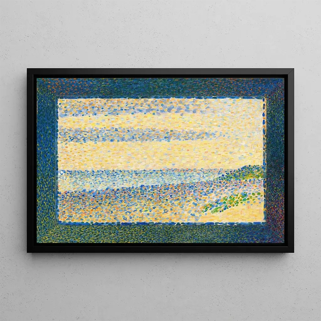 Le tableau Paysage marin Gravelines de Georges Seurat est une œuvre captivante qui évoque la tranquillité des côtes françaises. À travers des touches de couleur pointillistes, Seurat parvient à créer une atmosphère sereine où la mer et le ciel se rencontrent dans un dégradé de bleus et de verts. La composition, bien équilibrée, invite à la contemplation, tandis que les personnages en arrière-plan ajoutent une dimension humaine à ce paysage naturel. Ce tableau, à la fois simple et complexe, témoigne de la maîtrise technique de Seurat et de sa capacité à capturer la lumière et l'émotion.