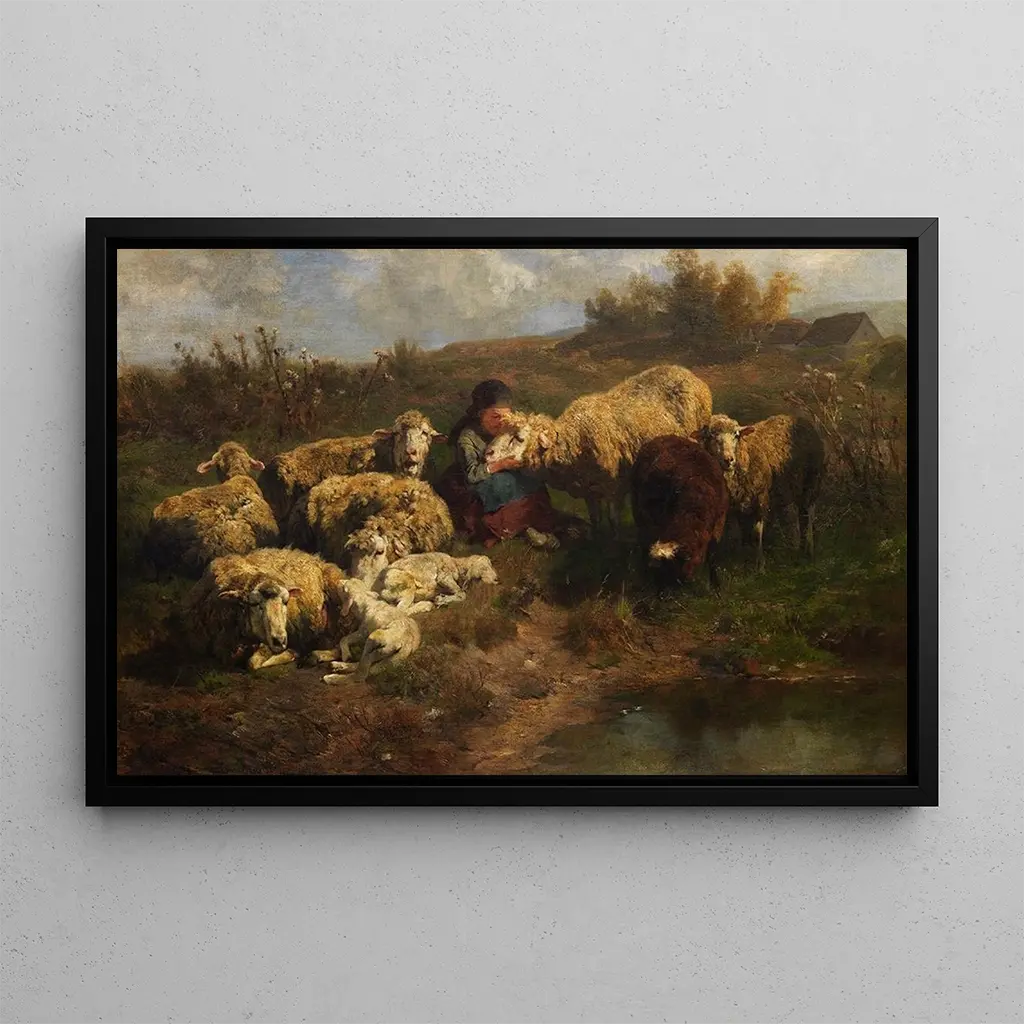 Anton Braith, peintre allemand du XIXe siècle, est reconnu pour ses représentations de la vie rurale et des animaux. Influencé par le mouvement romantique, il a su capturer l'harmonie entre l'homme et la nature. Sa carrière s'étend sur plusieurs décennies, durant lesquelles il a produit de nombreuses œuvres célébrant la beauté des paysages et des scènes de la vie quotidienne. "Petite bergère avec moutons" s'inscrit dans une période où l'artiste cherchait à exprimer la simplicité et la pureté de la vie à la campagne. Ses tableaux, souvent empreints de nostalgie, témoignent d'une époque où la nature était au cœur des préoccupations artistiques.