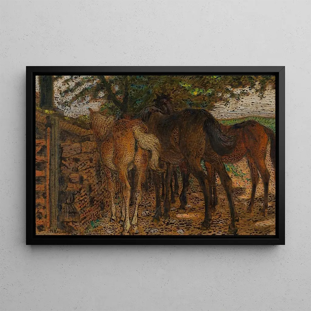 Près du mur : une scène de vie intimiste et poétique Dans "Près du mur", Nils Kreuger nous transporte dans un univers empreint de douceur et de sérénité. La composition met en avant des personnages absorbés dans leurs pensées, adossés à un mur qui semble être le témoin silencieux de leur quotidien. Les couleurs pastel, dominées par des nuances de bleu et de beige, créent une atmosphère apaisante, presque rêveuse. La technique de Kreuger, qui mêle habilement le réalisme à une touche impressionniste, donne vie à cette scène, invitant le spectateur à s'immiscer dans l'intimité de ces personnages. Chaque détail, des ombres délicates aux lumières tamisées, contribue à l'émotion qui se dégage de cette œuvre. Nils Kreuger : un maître du paysage et de la vie quotidienne Nils Kreuger, peintre suédois actif à la fin du XIXe siècle, est reconnu pour sa capacité à capturer la beauté des scènes de la vie quotidienne. Influencé par le mouvement impressionniste, il développe un style qui allie réalisme et poésie. Kreuger a souvent exploré les thèmes de la nature et des interactions humaines, cherchant à immortaliser des moments fugaces. Son travail est emblématique de l'époque où l'art se tourne vers le quotidien, s'éloignant des sujets historiques ou mythologiques. En tant que membre de l'école de peinture de Stockholm, il a laissé un héritage durable qui continue d'inspirer les artistes contemporains. Une acquisition décorative aux multiples atouts La reproduction de "Près du mur" est une pièce décorative qui saura enrichir n'importe quel intérieur, que ce soit dans un salon, un bureau ou une chambre. Sa qualité d'impression garantit une fidélité remarquable aux couleurs et aux détails de l'œuvre originale, permettant ainsi de profiter pleinement de l'atmosphère unique qu'elle dégage. En intégrant ce tableau dans votre décoration, vous apportez une touche d'élégance et de sérénité à votre espace. L'attrait esthétique de cette toile en fait un choix idéal pour ceux qui souhaitent créer un environnement inspirant et apaisant, tout en célébrant l'art de Nils Kreuger.
