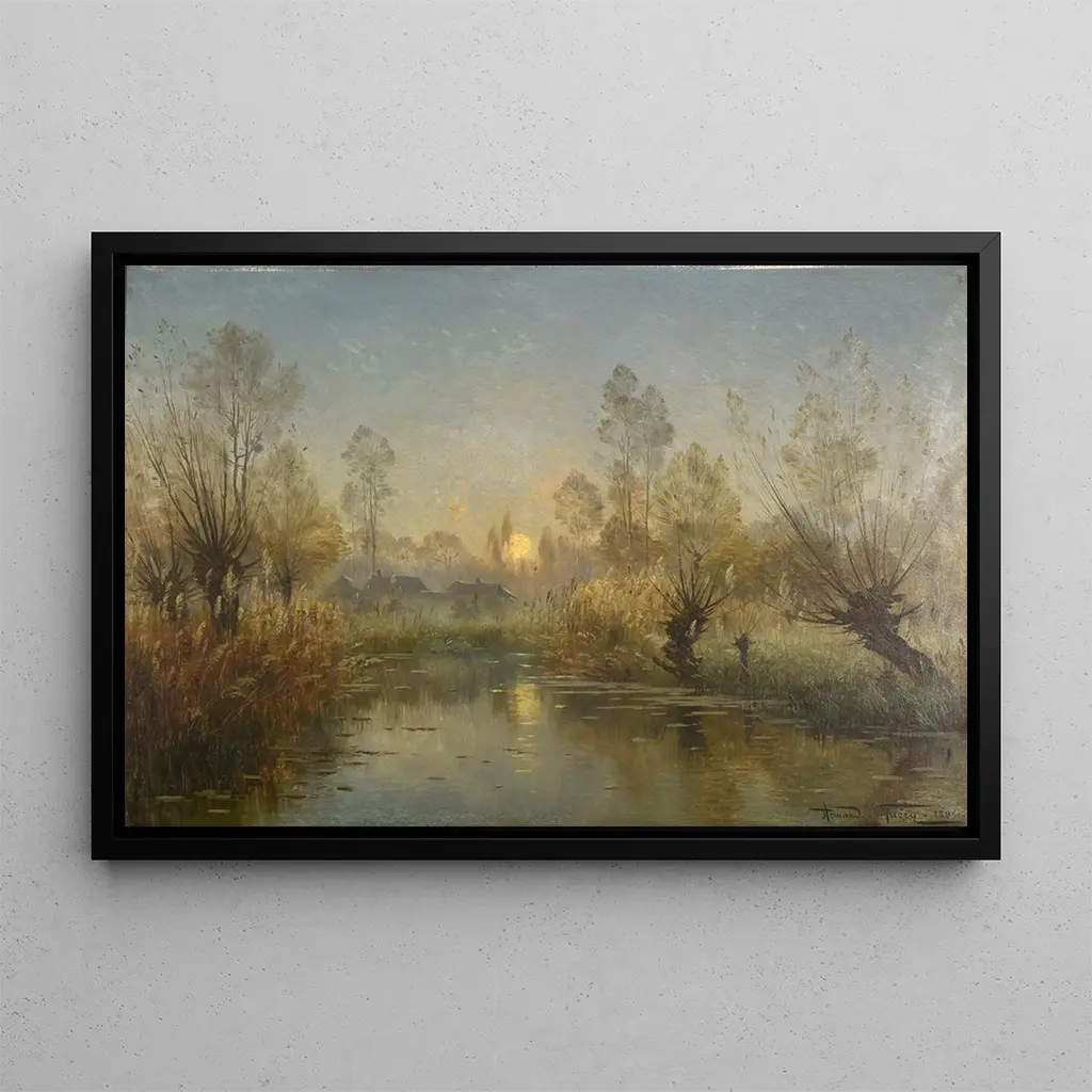 La toile "Rivière au soleil couchant" d'Armand Gury évoque une atmosphère paisible et contemplative. Les couleurs chaudes du coucher de soleil se reflètent sur les eaux calmes de la rivière, créant un jeu de lumière fascinant. Les nuances d'orange, de rose et de violet se mêlent harmonieusement, tandis que les silhouettes des arbres bordant la rive ajoutent une touche de mystère. La technique de Gury, qui combine le réalisme et l'impressionnisme, permet de ressentir la douceur du moment. Cette œuvre invite le spectateur à s'évader et à apprécier la beauté éphémère de la nature.