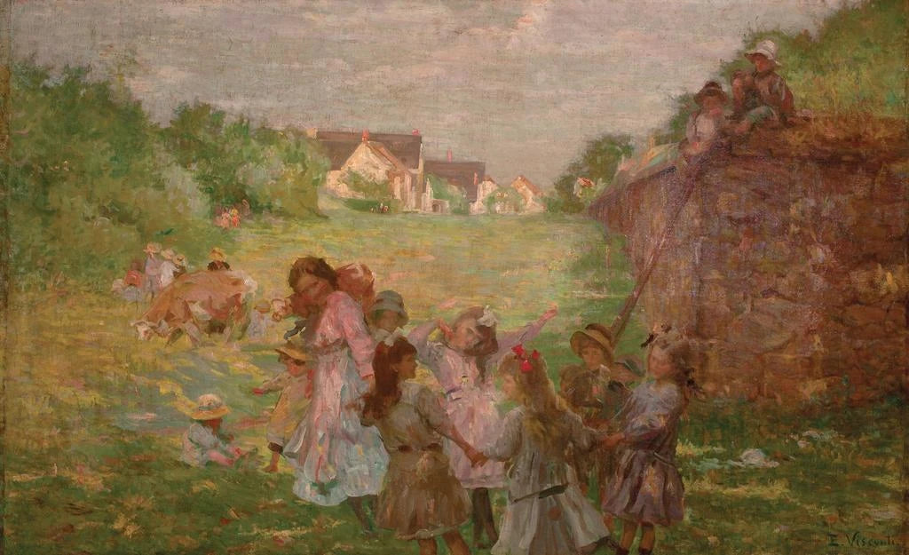 La toile "Ronde d'enfants" d'Eliseu Visconti évoque une atmosphère joyeuse et ludique. Les enfants, capturés dans un moment de jeu, sont entourés de couleurs vives et de formes douces qui transmettent une sensation de bonheur et de légèreté. La technique de l'artiste, mêlant impressionnisme et réalisme, permet de créer une scène vivante où chaque enfant semble animé d'une personnalité propre. Les nuances de bleu et de vert, associées à des touches de jaune, renforcent la fraîcheur de cette composition, invitant le spectateur à plonger dans un univers d'innocence et de joie enfantine.