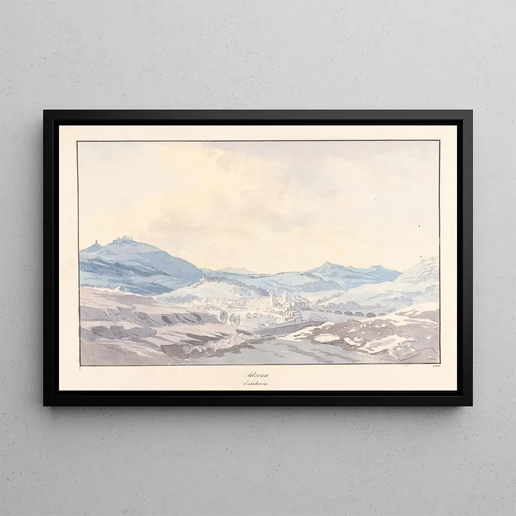 Detta konsttryck av Salsona Katalonien av Charles Hamilton Smith förflyttar oss till hjärtat av ett pittoreskt landskap, där naturen blomstrar i en palett av strålande färger. De gröna nyanserna på kullarna blandas med de gyllene tonerna av solnedgången, vilket skapar en varm och välkomnande atmosfär. Akvarelltekniken, som behärskas av konstnären, gör det möjligt att fånga vattnets flyt och molnens lätthet. Varje penseldrag verkar berätta en historia och inbjuder betraktaren att fördjupa sig i denna idylliska scen, där tiden tycks stå still.