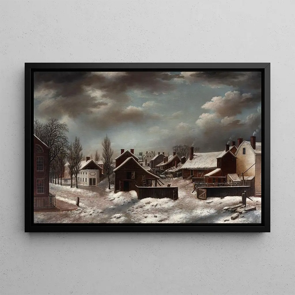La reproduction de Scène d'hiver à Brooklyn évoque une atmosphère paisible et mélancolique, où la neige recouvre délicatement les toits des maisons et les arbres. Les teintes froides de bleu et de blanc se mêlent aux touches chaleureuses des lumières intérieures, créant un contraste saisissant. La technique de l'huile sur toile permet à Francis Guy de capturer la texture de la neige et la douceur de la lumière hivernale. L'œuvre invite le spectateur à s'immerger dans ce paysage tranquille, à ressentir le silence apaisant d'un hiver new-yorkais.