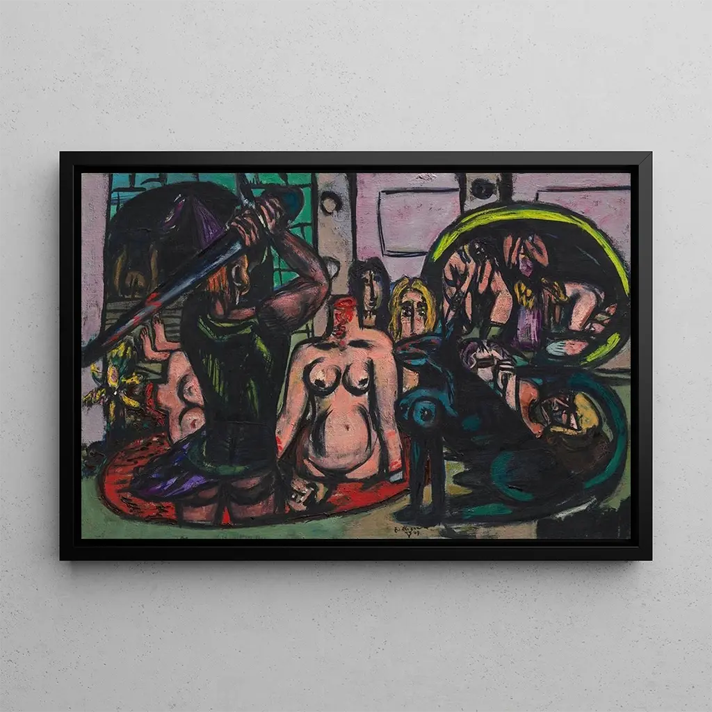 Dernat konsttryck av Perseus plikt av Max Beckmann tar oss med till en värld fylld av känslor och symbolik. Detta verk, med sina livfulla färger och uttrycksfulla former, illustrerar det tragiska ögonblicket då Perseus förbereder sig för att fullfölja sitt öde. Den komplexa kompositionen, som blandar mänskliga figurer och mytologiska element, skapar en atmosfär som är både mörk och fängslande. Beckmann, med sin unika stil, lyckas förmedla den dramatiska spänningen i scenen och inbjuder betraktaren att känna tyngden av det öde som vilar på hjälten.