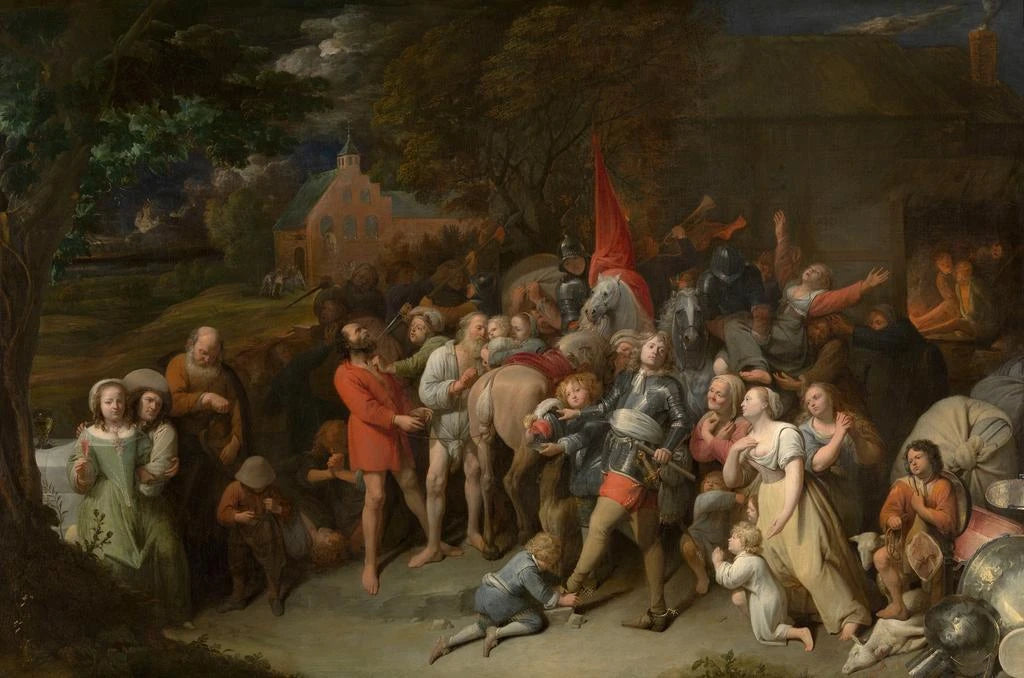 Dans "Soldats pillards", David Ryckaert III dépeint une scène saisissante où l'intensité dramatique est palpable. Les couleurs sombres et terreuses dominent la composition, accentuant le sentiment de chaos et de désespoir. Les personnages, figés dans des poses expressives, transmettent une émotion brute qui capte l'attention du spectateur. La technique de Ryckaert, caractérisée par un réalisme minutieux, permet de ressentir la tension de cette confrontation, tandis que les détails des armes et des vêtements des soldats ajoutent une profondeur historique à l'œuvre. Ce tableau est une véritable invitation à réfléchir sur les conséquences de la guerre et de la violence.