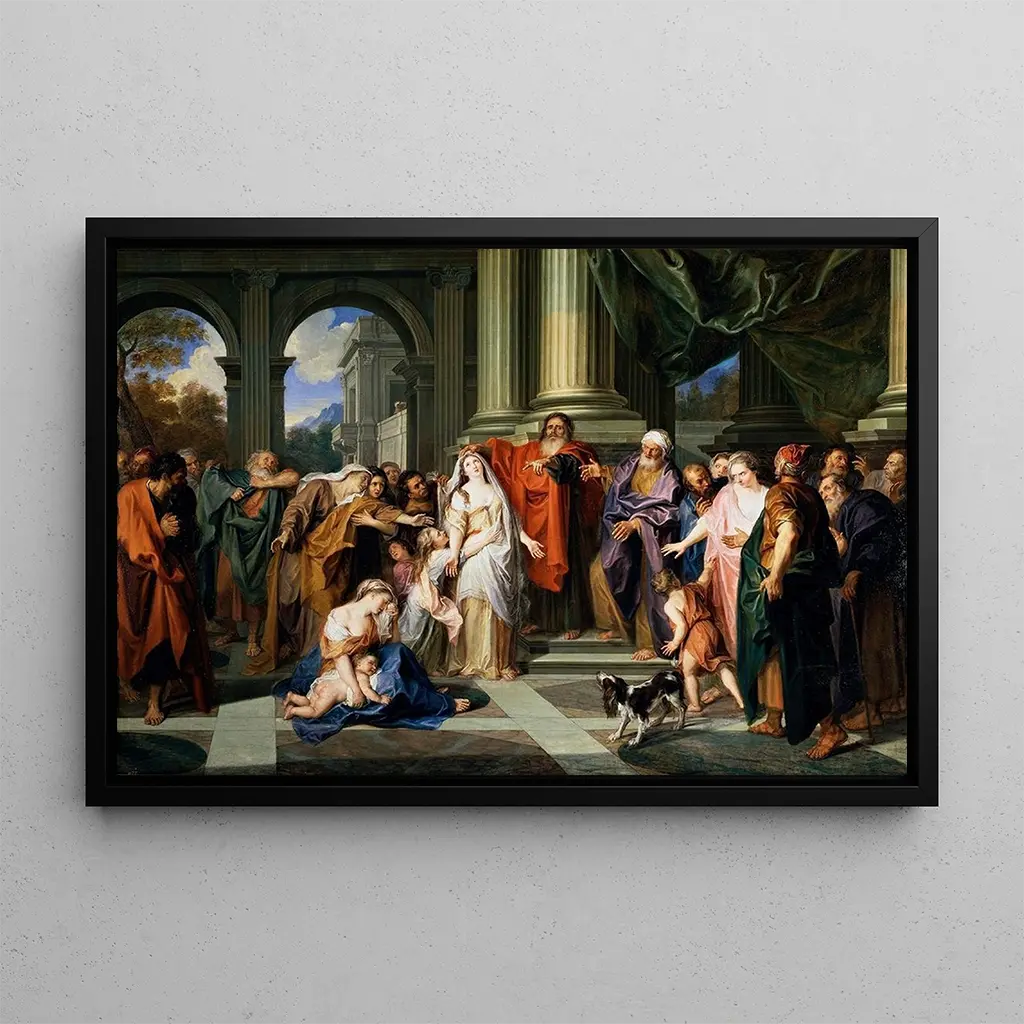" Suzanne anklagad för otrohet" av Antoine Coypel är ett konsttryck som fångar den dramatiska intensiteten i en biblisk scen. Kompositionen framhäver Suzanne, i centrum av konstverket, omgiven av anklagande domare, medan ett mjukt ljus lyser upp hennes ansikte fyllt av förtvivlan. De varma färgerna och de noggranna detaljerna i kläder och uttryck hos figurerna förstärker den emotionella effekten av scenen. Coypels teknik, som blandar chiaroscuro och en rik palett, skapar en atmosfär som är både tragisk och fängslande, och inbjuder betraktaren att reflektera över teman som rättvisa och orättvisa.