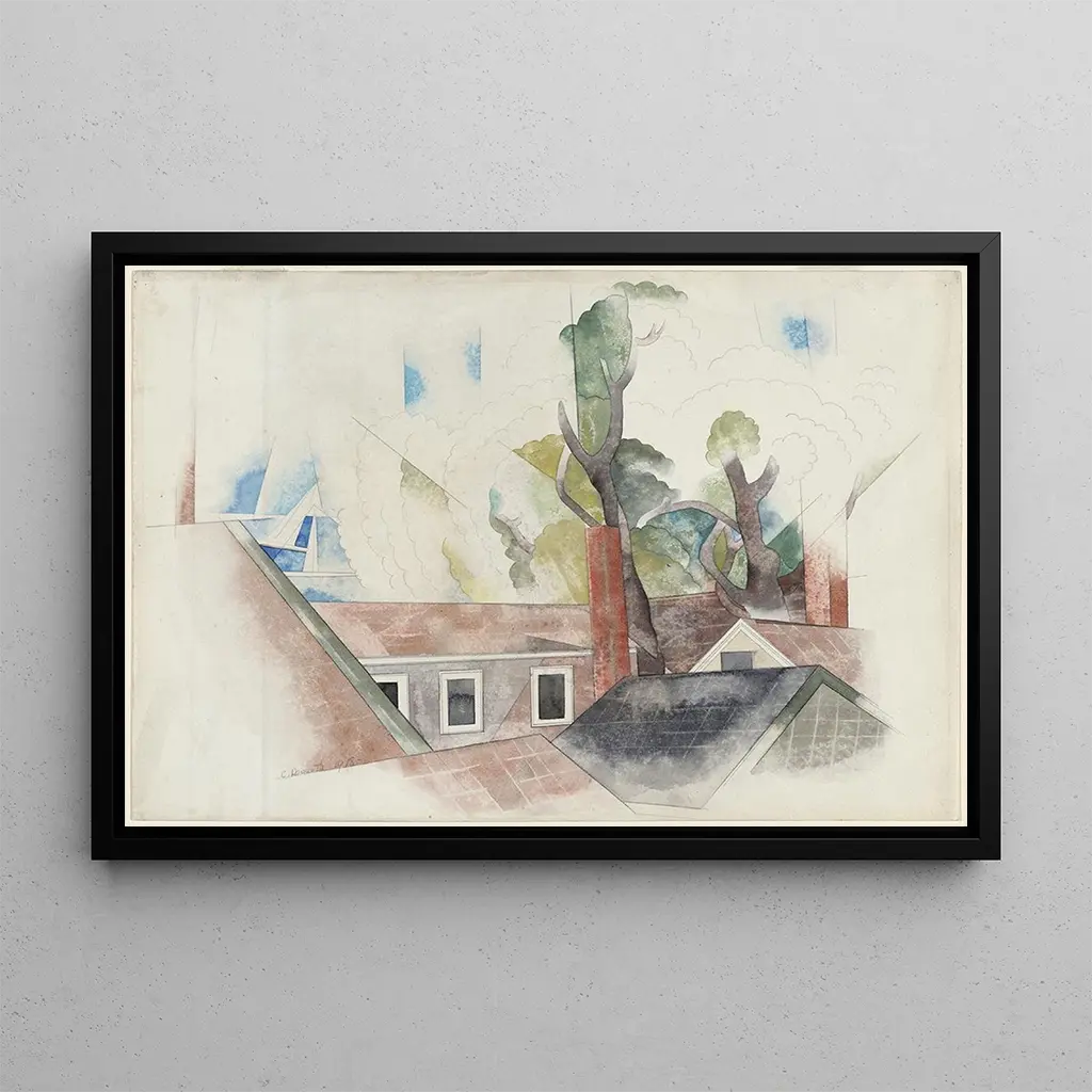 La toile "Toits et arbres" de Charles Demuth offre une vision poétique d'un paysage urbain où la verdure s'entrelace avec les structures bâties. Les teintes douces et les formes géométriques des toits contrastent avec la fluidité des arbres, créant une composition équilibrée et apaisante. Demuth utilise une technique de peinture à l'aquarelle qui permet de jouer avec la lumière et la transparence, donnant vie à cette scène tranquille. L'atmosphère qui se dégage de cette œuvre invite à une réflexion sur la coexistence de la nature et de l'urbanisme, tout en célébrant la beauté des détails souvent négligés.