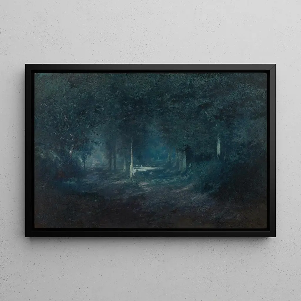 Bois au clair de lune, ett konsttryck av Adrien Joseph Heymans, skildrar en nattlig scen fylld av mystik och poesi. Tavlan avbildar ett skogsscenario badat i månens silverljus, där träden står majestätiskt. Nyansen av blått och svart blandas subtilt, vilket skapar en atmosfär som är både lugn och förtrollande. Heymans teknik, med sina flytande penseldrag och sin mästerskap över ljuset, ger liv åt denna nattliga scen och bjuder in betraktaren att utforska skogens djup. Varje detalj, från glittrande blad till dansande skuggor, bidrar till en magisk och kontemplativ atmosfär.