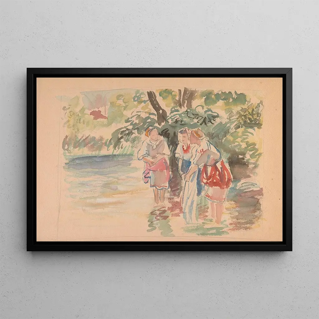 Dans cette reproduction de l'œuvre "Trois femmes marchant dans la rivière", l'artiste Ivan Ivanec capture un moment de sérénité au bord de l'eau. Les trois figures féminines, vêtues de robes légères, avancent lentement dans un environnement naturel baigné de lumière. Les couleurs douces et pastel, mêlant des nuances de bleu et de vert, évoquent une atmosphère de tranquillité et de fraîcheur. La technique de l'artiste, qui allie réalisme et impressionnisme, permet de ressentir la fluidité de l'eau et la douceur de l'air. Cette toile invite à la contemplation, à l'évasion vers un monde où le temps semble suspendu.
