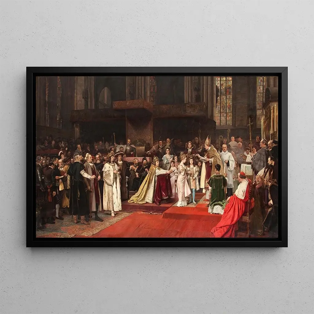 Václav Brožík, peintre tchèque du XIXe siècle, est reconnu pour son rôle dans le mouvement néo-renaissance. Formé à l'Académie des beaux-arts de Prague, il a été influencé par les grands maîtres de la peinture européenne, notamment par l'art italien. Brožík a su capturer l'essence de son époque à travers des œuvres qui mêlent histoire et mythologie. Son style, caractérisé par une attention minutieuse aux détails et une palette de couleurs harmonieuse, témoigne de son désir de célébrer la culture et l'identité nationale. L'œuvre Tu felix Austria nube, en particulier, illustre son engagement à représenter des thèmes historiques avec une sensibilité moderne.