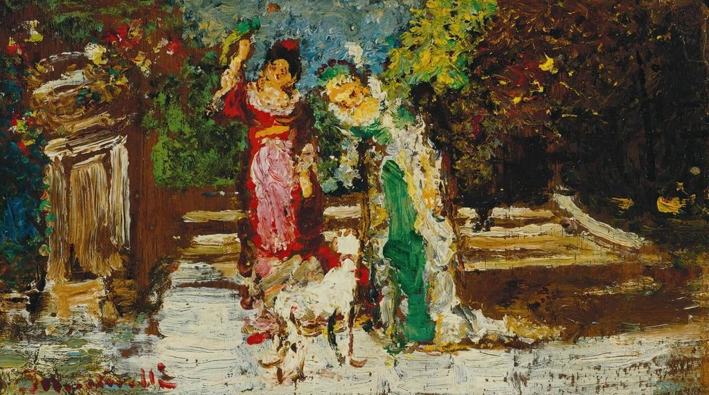 Två kvinnor och hund - Adolphe Monticelli