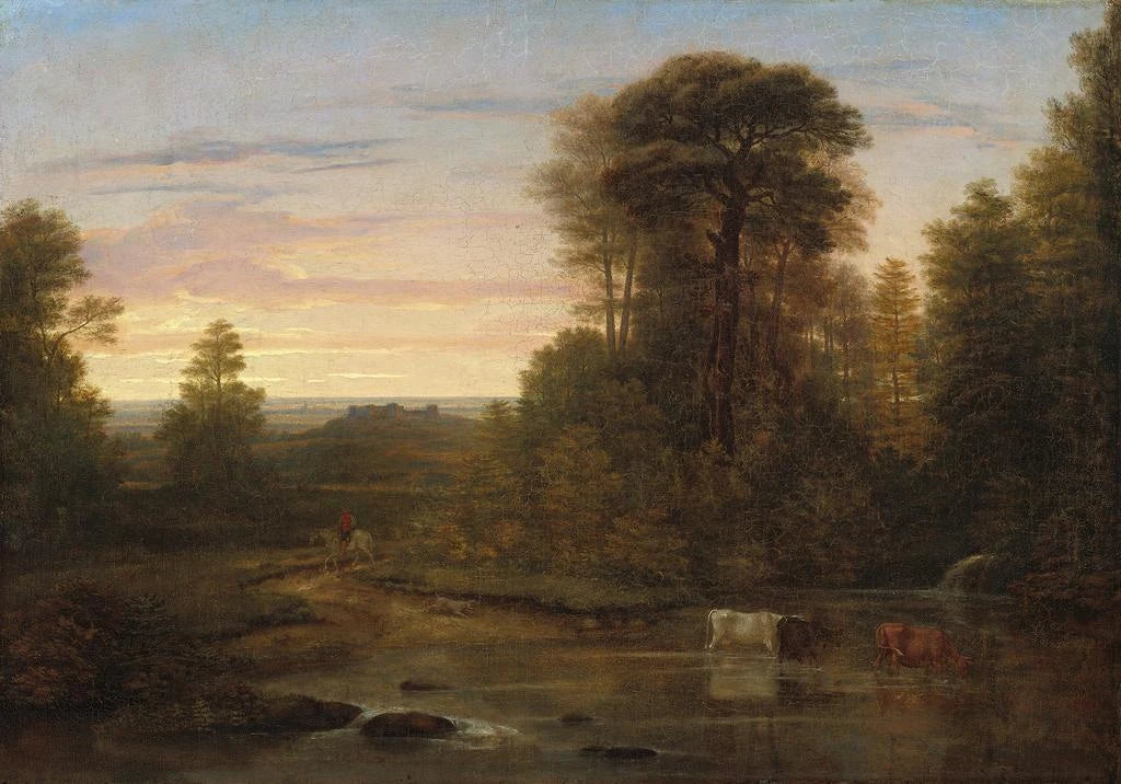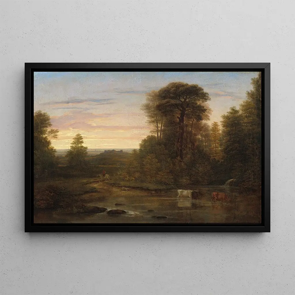 Washington Allston, peintre et poète du début du XIXe siècle, est souvent considéré comme l'un des précurseurs du romantisme américain. Influencé par les maîtres européens, notamment Turner et Constable, Allston a su développer un style unique qui mêle réalisme et émotion. Sa carrière, marquée par des voyages en Europe, lui a permis d'incorporer des éléments de la nature dans ses œuvres, tout en explorant des thèmes spirituels et poétiques. "Un paysage après le coucher du soleil" s'inscrit dans cette quête d'une beauté transcendante, reflétant l'importance de la nature dans l'art américain naissant.