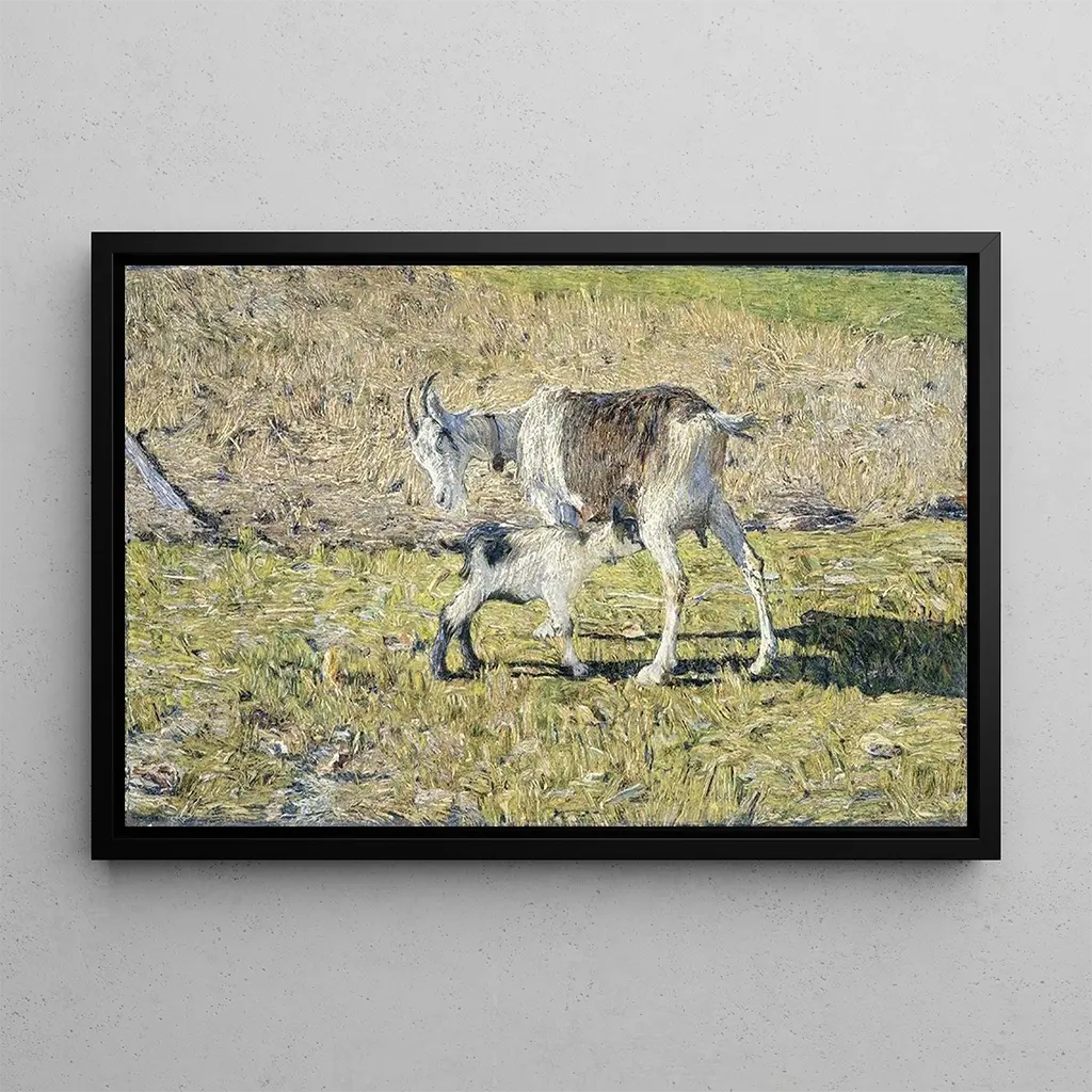 Une chèvre avec son chevreau : une tendresse bucolique à l'état pur La toile "Une chèvre avec son chevreau" de Giovanni Segantini évoque une scène empreinte de douceur et de sérénité. Les couleurs douces, mêlant des nuances de vert et de brun, plongent le spectateur dans un paysage pastoral où la nature et les animaux cohabitent harmonieusement. La technique de Segantini, caractérisée par un pointillisme délicat, permet de capturer la lumière et la texture de la fourrure de la chèvre et de son petit. L'atmosphère qui se dégage de cette œuvre est à la fois apaisante et joyeuse, invitant à une contemplation silencieuse de la beauté simple de la vie rurale. Giovanni Segantini : un maître du symbolisme et de la lumière Giovanni Segantini, peintre suisse du XIXe siècle, est reconnu pour son rôle majeur dans le mouvement symboliste. Influencé par l'impressionnisme, il développe un style unique qui met en avant la lumière et les émotions à travers des paysages alpins et des scènes de la vie quotidienne. Sa carrière est marquée par une quête de spiritualité et d'harmonie avec la nature, ce qui se reflète dans des œuvres comme "Une chèvre avec son chevreau". Segantini a su capturer l'essence de son époque, en s'inscrivant dans un courant artistique qui valorise la subjectivité et l'expérience personnelle. Une acquisition décorative aux multiples atouts La reproduction de "Une chèvre avec son chevreau" est une pièce décorative qui saura embellir tout espace, que ce soit un salon, un bureau ou une chambre. Sa qualité d'impression fidèle et son attrait esthétique en font un choix idéal pour ceux qui souhaitent apporter une touche de nature et de douceur à leur intérieur. Ce tableau, par sa simplicité et son charme, invite à la rêverie et à la contemplation, tout en s'intégrant harmonieusement dans divers styles de décoration. Offrez-vous cette toile pour enrichir votre environnement d'une atmosphère chaleureuse et accueillante.