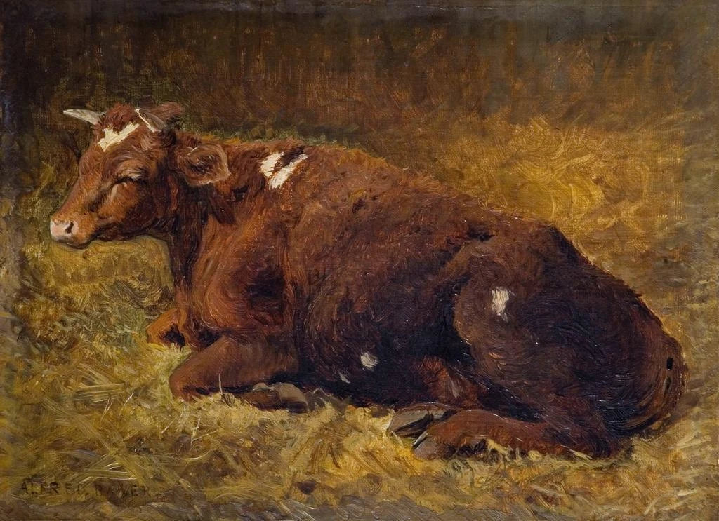La toile "Une vache couchée sur le sol" d'Alfred Baker évoque une scène bucolique empreinte de tranquillité. La composition met en avant une vache paisiblement allongée sur un sol verdoyant, entourée d'une nature luxuriante. Les couleurs douces et terreuses, allant des verts profonds aux bruns chauds, créent une atmosphère apaisante. La technique de l'artiste, qui mêle réalisme et impressionnisme, permet de ressentir la chaleur du soleil sur le pelage de l'animal. Ce tableau invite à la contemplation, à une pause dans le tumulte du quotidien, et nous rappelle la beauté simple de la vie rurale.