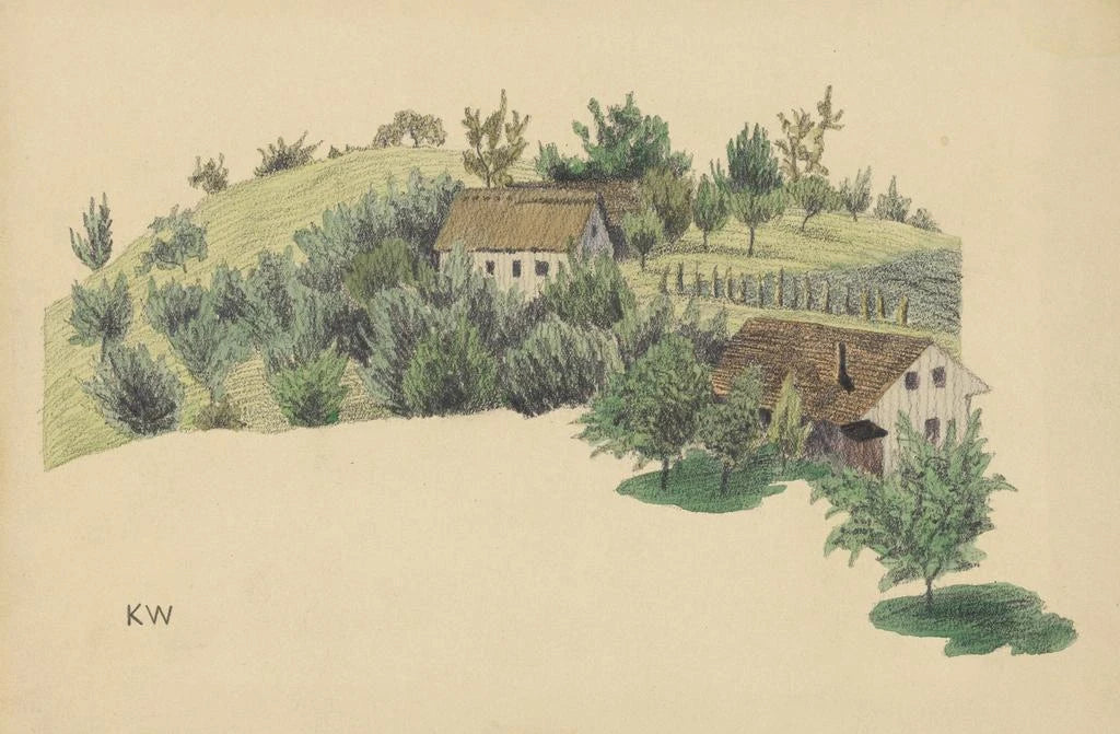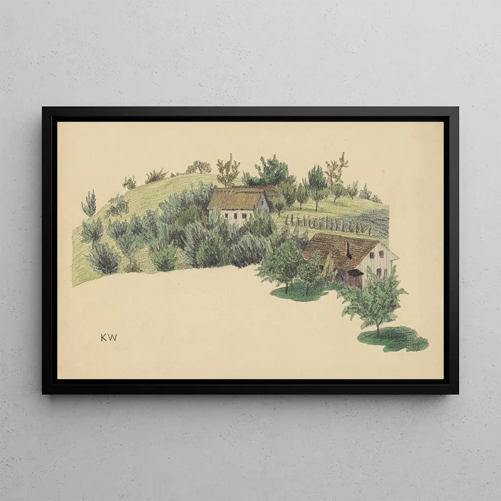 I verket "Sans Titre Maisons de Paysans sur Colline" fördjupar Karl Wiener oss i ett lantligt landskap präglat av enkelhet och äkthet. Husen, placerade på en grönskande kulle, badar i ett mjukt ljus som framhäver texturerna på taken och väggarna. Kompositionen är balanserad, med mjuka linjer som guidar blicken genom målningen. De jordnära färgerna och nyanser av grönt framkallar en fridfull, nästan nostalgisk atmosfär, som påminner om en tid då det rurala livet stod i centrum för människors bekymmer.