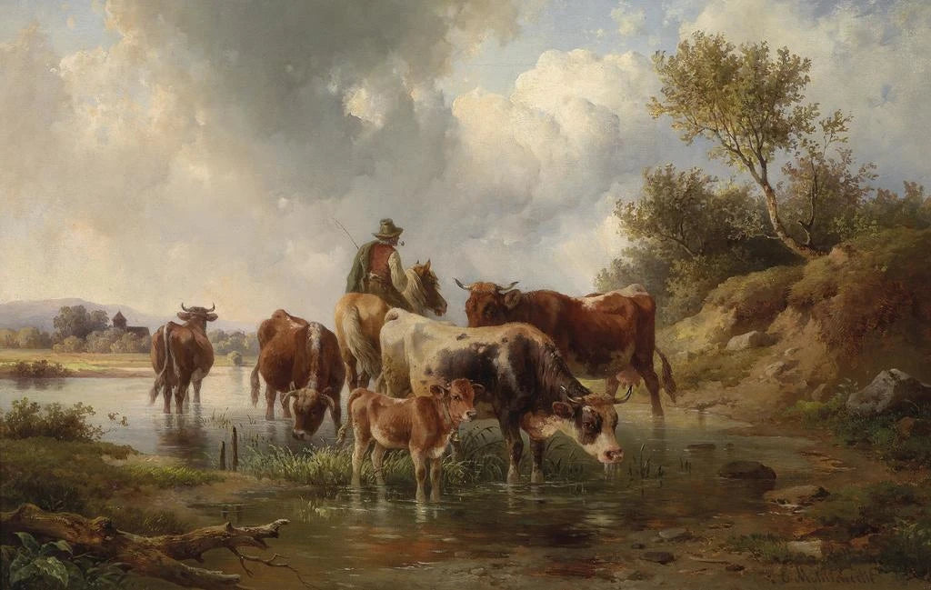 Edmund Mahlknecht, actif au XIXe siècle, est un artiste dont les œuvres reflètent les traditions et les paysages de la campagne européenne. Influencé par le mouvement romantique, il a su capturer des moments de la vie quotidienne avec une sensibilité unique. Sa période est marquée par un retour à la nature et une valorisation des scènes rurales, témoignant d'une époque où l'industrialisation commençait à transformer le paysage. Mahlknecht, par son art, nous rappelle l'importance de la nature et des activités humaines, faisant de lui un artiste essentiel pour comprendre cette transition.