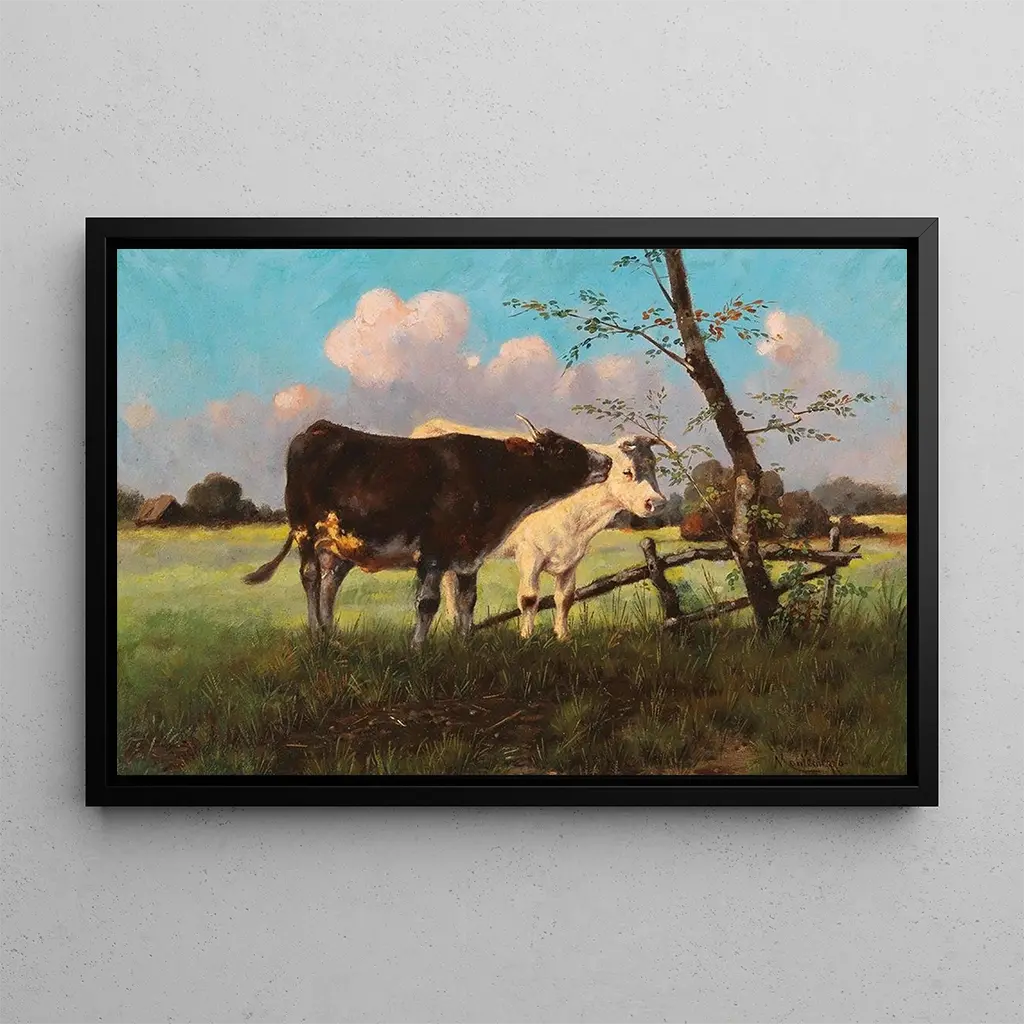 La reproduction Vaches dans un pré d'Antonio Montemezzo capture la tranquillité d'une scène pastorale, où les vaches paissent paisiblement dans un paysage verdoyant. Les couleurs vibrantes et naturelles évoquent la beauté de la campagne, tandis que la lumière douce illumine la toile, créant une atmosphère chaleureuse et accueillante. Montemezzo utilise des techniques de peinture qui donnent vie aux textures de l'herbe et des animaux, rendant chaque détail palpable. Cette œuvre invite à une pause contemplative, un moment de connexion avec la nature.