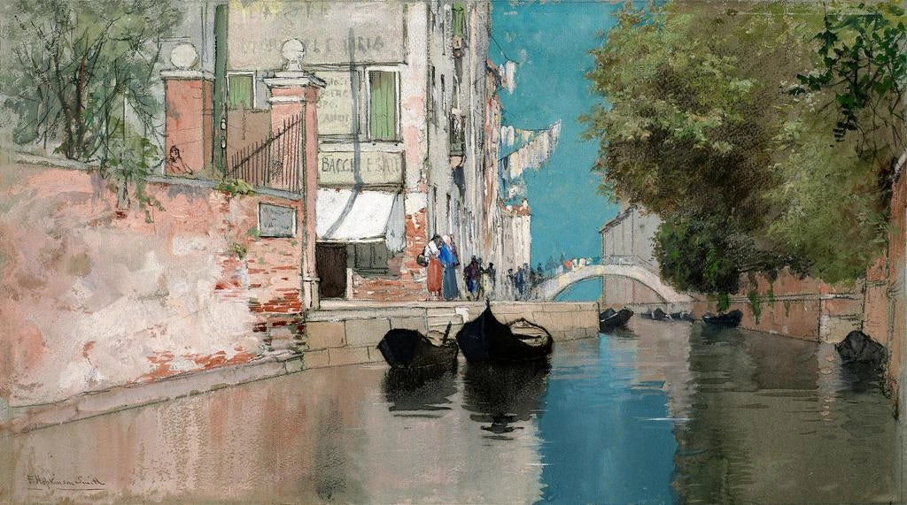 Francis Hopkinson Smith, verksam i slutet av 1800-talet och början av 1900-talet, är en amerikansk konstnär med mångsidiga talanger, från målning till skrivande. Påverkad av sina resor i Europa utvecklar han en impressionistisk stil som lyfter fram ljuset och färgen. Venedig är ett av hans mest kända konsttryck, som vittnar om hans beundran för denna unika stad. Genom sina målningar lyckas Smith förmedla essensen av Venedig, och fånga dess charm och mysterium. Hans förmåga att immortalize scener ur vardagslivet gör honom till en oumbärlig konstnär i sin tid.
