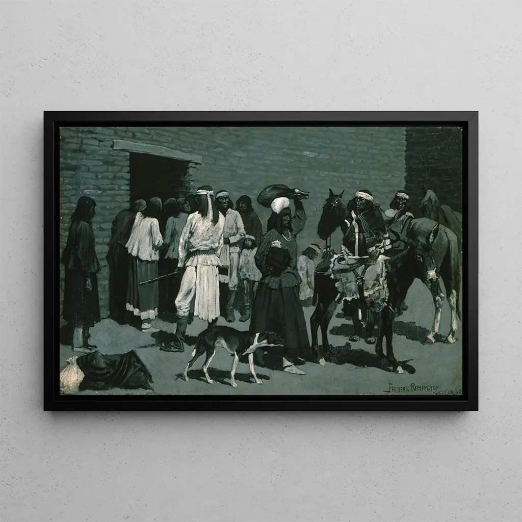 Le tableau Village indien Pueblo de Frederic Remington nous transporte au cœur des paysages majestueux du Sud-Ouest américain. Cette œuvre vibrante dépeint une scène de vie au sein d'un village Pueblo, où les maisons en adobe s'intègrent harmonieusement dans le décor naturel. Les couleurs chaudes, allant des ocres aux rouges profonds, évoquent la terre et le ciel, tandis que les personnages, vêtus de costumes traditionnels, ajoutent une dimension humaine à cette représentation. Remington, avec sa technique précise et dynamique, parvient à capturer l'essence de la culture amérindienne, rendant hommage à un mode de vie en parfaite symbiose avec la nature.