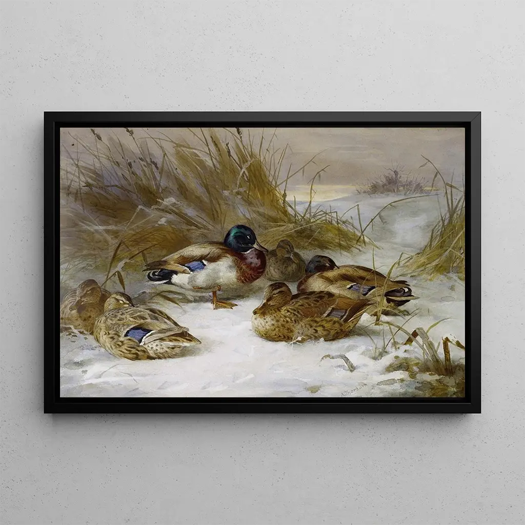 Det konsttryck Landskap med vinter och gräsand av Archibald Thorburn skildrar ett snöklätt landskap, där vinterens lugn förstärks av en glidande gräsand på det frusna vattnet. De vita och blå nyanser dominerar, vilket skapar en fridfull och tyst atmosfär. Detaljernas finhet, från snöflingor till reflektioner på vattnet, vittnar om konstnärens tekniska skicklighet. Detta konsttryck inbjuder till en mjuk eftertanke, där vinterns naturskönhet långsamt avslöjas, som en välbevarad hemlighet.