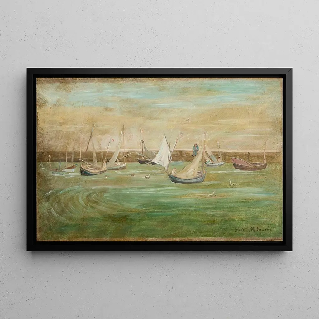 Voiliers : une danse sur les flots. Dans cette œuvre de Tadeusz Makowski, les voiliers prennent vie, glissant avec grâce sur les eaux calmes. Les couleurs vives et les formes stylisées évoquent une atmosphère joyeuse et dynamique, où le mouvement des voiles semble presque palpable. Makowski, avec son approche unique, parvient à capturer l’essence même de la navigation, mêlant abstraction et réalité. Chaque élément de la composition, des voiles aux reflets sur l’eau, est soigneusement orchestré pour créer une harmonie visuelle qui transporte le spectateur dans un monde maritime enchanteur. Tadeusz Makowski : un pionnier du modernisme polonais. Artiste polonais actif au début du XXe siècle, Tadeusz Makowski est reconnu pour son style innovant qui allie influences cubistes et expressionnistes. Sa carrière, marquée par des voyages en France, lui permet de s’imprégner des courants artistiques européens tout en restant profondément ancré dans sa culture d’origine. Makowski a su se démarquer par sa capacité à réinterpréter des thèmes traditionnels, comme la navigation, à travers une lentille moderne. Son œuvre, bien que moins connue que celle de certains de ses contemporains, joue un rôle crucial dans l’évolution de l’art polonais. Une acquisition décorative aux multiples atouts. La reproduction de cette toile de Tadeusz Makowski est un ajout précieux à toute collection d’art, apportant une touche de fraîcheur et de dynamisme à votre décoration intérieure. Que ce soit dans un salon, un bureau ou une chambre, ce tableau attire le regard et suscite l’admiration. Sa qualité d’impression garantit une fidélité exceptionnelle aux couleurs vibrantes et aux détails raffinés de l’œuvre originale. En choisissant cette reproduction, vous offrez à votre espace une ambiance maritime unique, tout en célébrant l’héritage artistique d’un maître du modernisme.