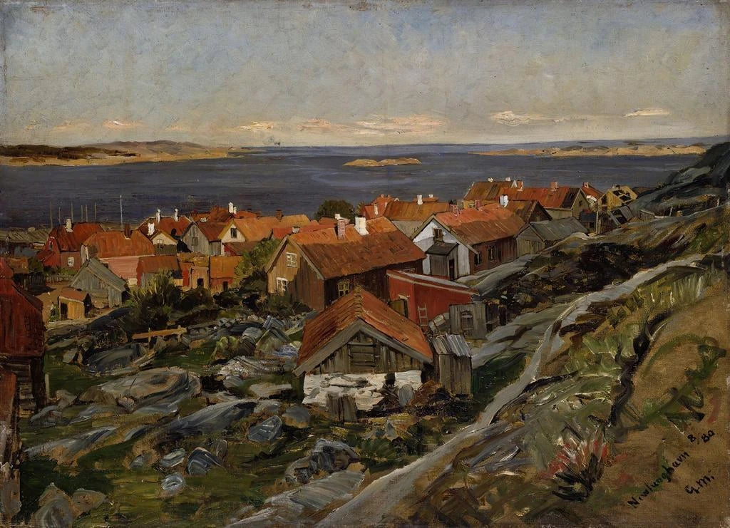 Gerhard Munthe, né en 1849, est un artiste norvégien qui a marqué son époque par son approche novatrice du symbolisme. Influencé par la nature scandinave et les traditions folkloriques, Munthe a su créer des œuvres qui résonnent avec l'âme du Nord. Sa période de création, à la fin du XIXe siècle, coïncide avec un renouveau artistique en Norvège, où les artistes cherchent à exprimer une identité nationale à travers leurs œuvres. La Vue de Nevlunghavn est emblématique de cette quête, offrant une vision romantique et idéalisée des paysages norvégiens.