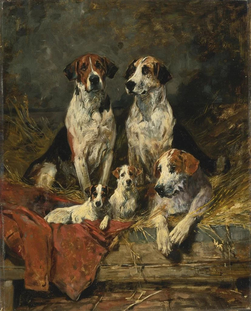 Ce magnifique art print représente une scène animée avec quatre lévriers foxhound et un terrier, capturant l'énergie et la grâce de ces chiens dans un style réaliste. Parfait pour les amateurs d'animaux ou comme décoration élégante pour votre maison ou bureau.