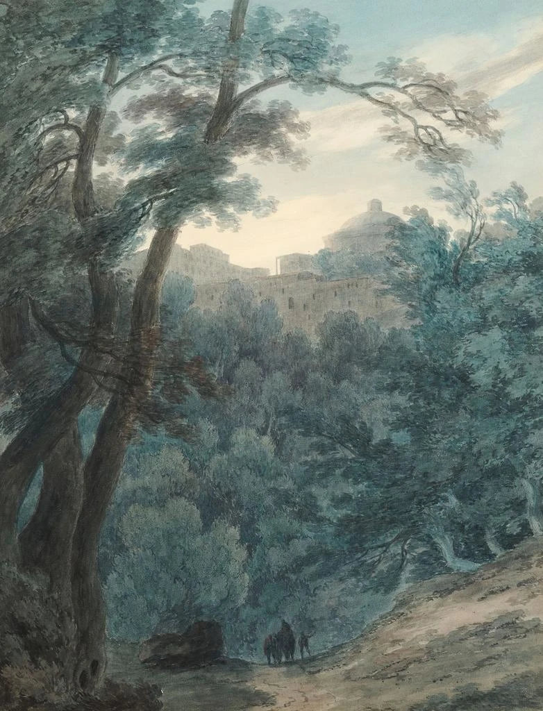 Skogigt landskap och Ariccia-kloster - John Robert Cozens
