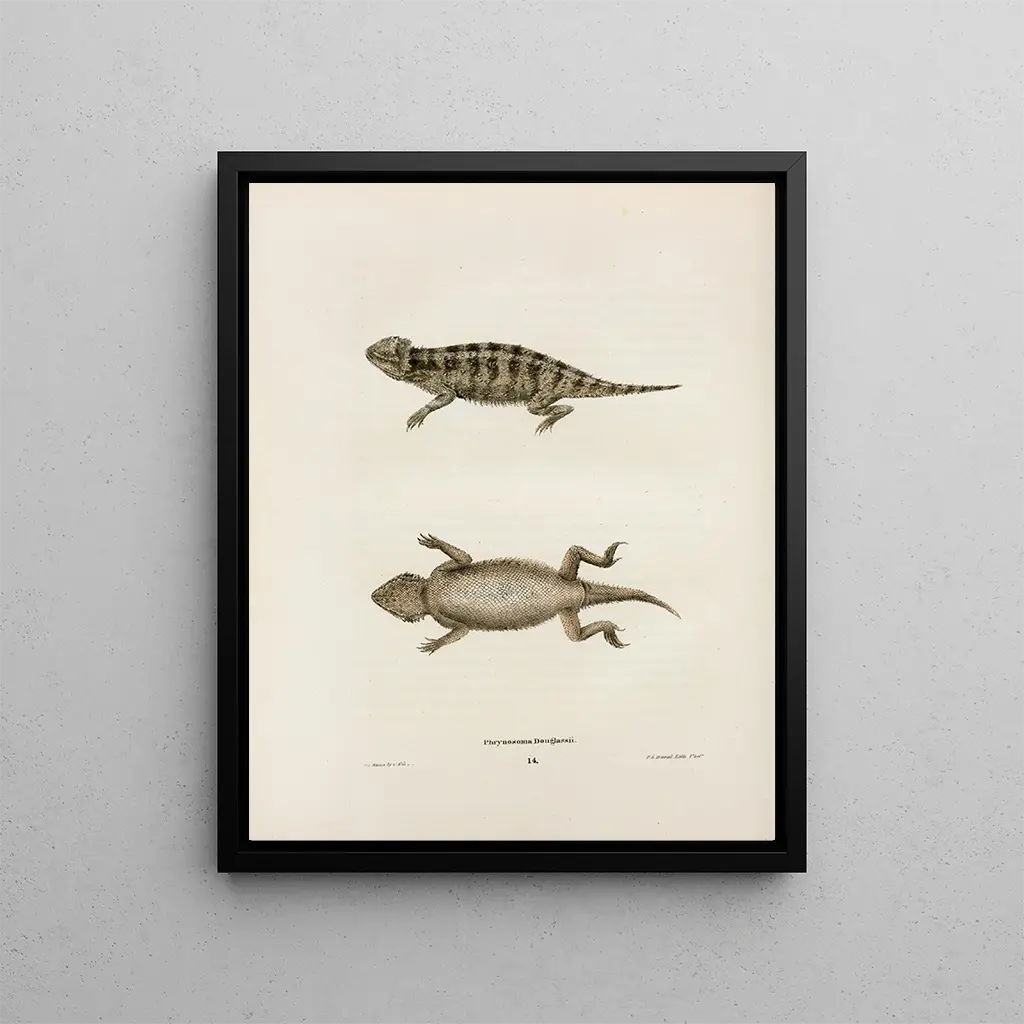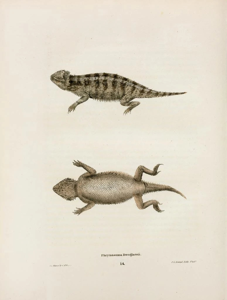 Upptäck den fascinerande världen av Phrynosoma douglassii, en unik art av hornödlor som är känd för sin distinkta utseende och anpassningar. Denna reproduktion av ett konstverk av John Edwards Holbrook fångar den exakta detaljrikedomen och skönheten hos denna fascinerande reptil, perfekt för att dekorera ditt hem eller kontor med en touch av naturens underverk.