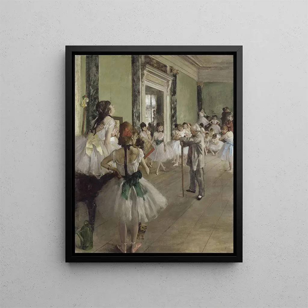 Edgar Degas' klass av balett är ett ikoniskt verk som fångar själva essensen av dansen genom impressionismens prisma. Detta konstverk, målat i slutet av 1800-talet, fördjupar oss i den fascinerande världen av ballerinas, där grace och noggrannhet möts. Scenen utspelar sig i en danssal, där unga flickor, klädda i tutus, övar under den uppmärksamma lärarens blick. Degas, mästare på observation, lyckas bevara ett flyktigt ögonblick, som inte bara avslöjar rörelsens skönhet utan också intimiteten i ett arbets- och disciplinmoment. Det mjuka ljuset som sipprar in genom fönstren skapar en nästan eterisk atmosfär, som inbjuder betraktaren att fördjupa sig i denna delikata och krävande värld.