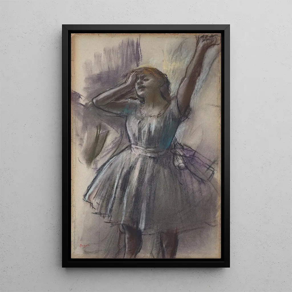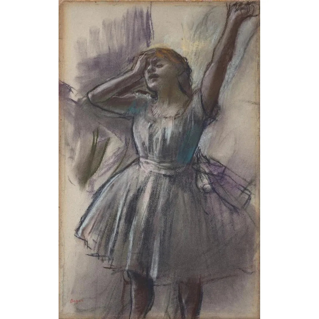 Konsttrycket av verket "Danseuse s'étirant" av Edgar Degas fångar ett flyktigt ögonblick i en ballerinas liv. Kompositionen framhäver den smala silhuetten av dansösen, vars rörelser verkar nästan sväva i tiden. Pastellfärgerna, mjuka och delikata, återskapar det dämpade ljuset i en dansstudio och skapar en intim atmosfär. Pastelltekniken, som används av Degas, möjliggör en fin återgivning av tygens textur och dansarens hud, vilket understryker konstnärens skönhet och koncentration under förberedelserna.