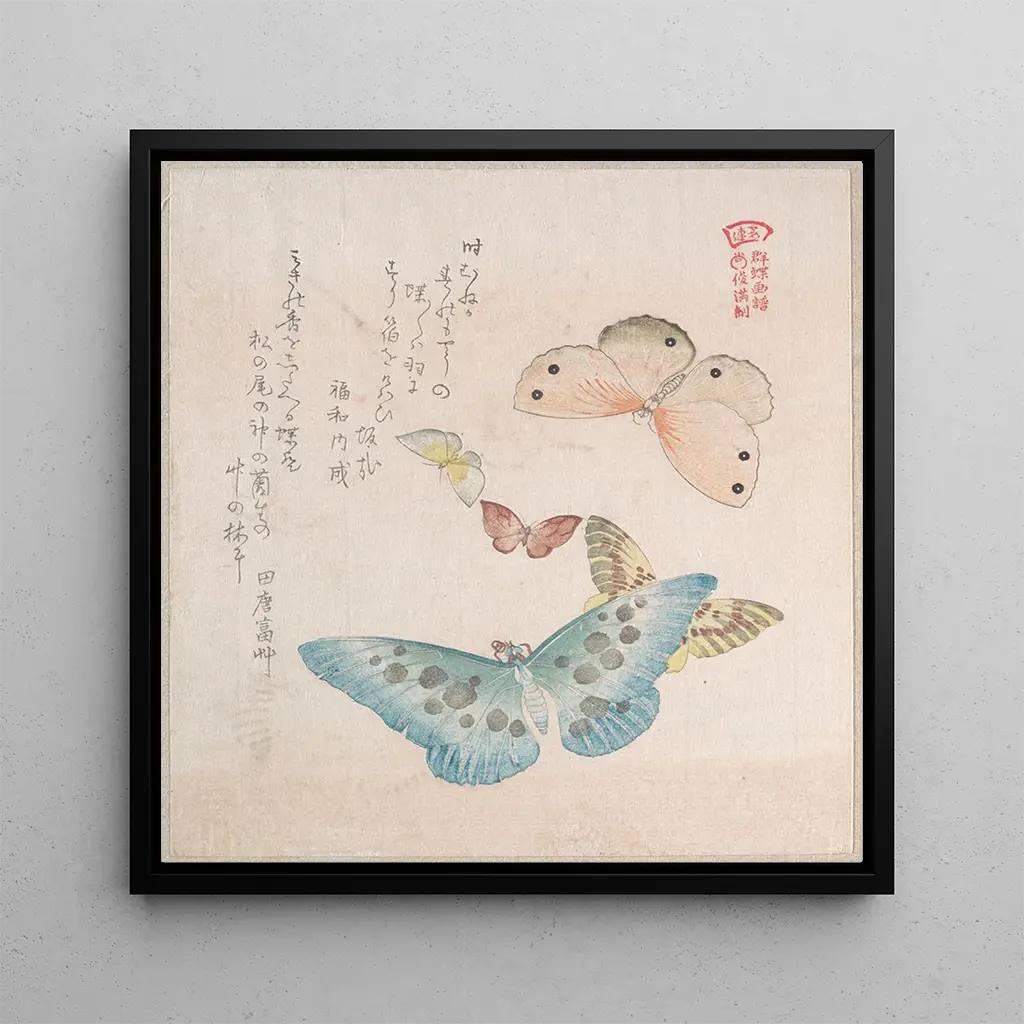 Kubo Shunman (1757–1820) tillhör ukiyo-e-traditionen där poetisk känslighet och tryckt hantverk möts. Som skapare av tryck, målare och lärd har han ofta avbildat djurliv, blommor och intima scener påverkade av smaken för natur och japansk litteratur. Hans verk utmärker sig genom en balanserad komposition och kalligrafisk linje, arvtagare till Edos måleriska strömningar. Shunmans tryck bidrog till att sprida en förfinad estetik utanför Japan, och denna produktion vittnar om hans inflytande på smaken för naturliga motiv och inredningsdekoration.