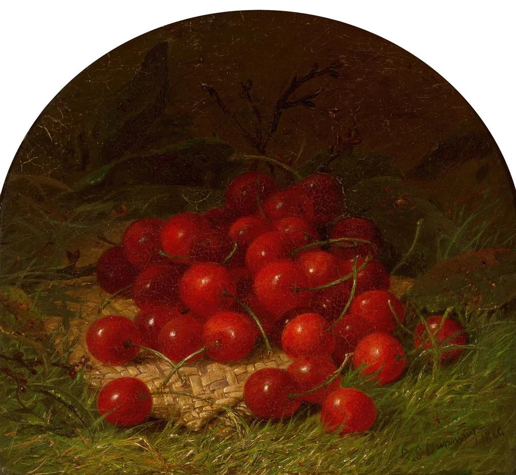 Robert Spear Dunning, en 1800-talets målare specialiserad på stilleben, utvecklade en noggrann praktik för botanisk och fruktåtergivning, ärvd från en amerikansk och europeisk realistisk tradition. Påverkad av realismens kanoner och kravet på vetenskaplig detalj, lyckades han förvandla vardagliga motiv till förfinade målningar som framhäver komposition och taktil återgivning. Hans verk vittnar om teknisk skicklighet — kontrollerad impasto, fina kromatiska övergångar — och en känslighet för blygsamma föremål som överskrider deras vardagliga användning. Nature morte avec des cerises illustrerar perfekt hans omsorg om visuell sanning och tyst elegans.